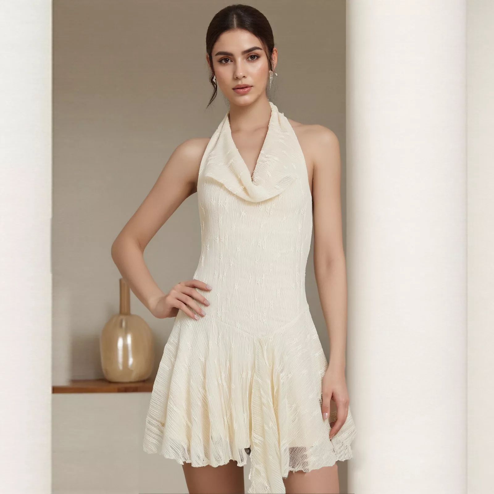 Slip into sultry summer style with this backless lace cowl neck mini dress – the ultimate showstopper for parties, club nights, and tropical getaways. Designed with a halter neckline and an open back, this dress strikes the perfect balance between sexy and chic. The lace detail adds a soft feminine touch, while the curve-hugging silhouette enhances your natural shape with just the right amount of stretch.