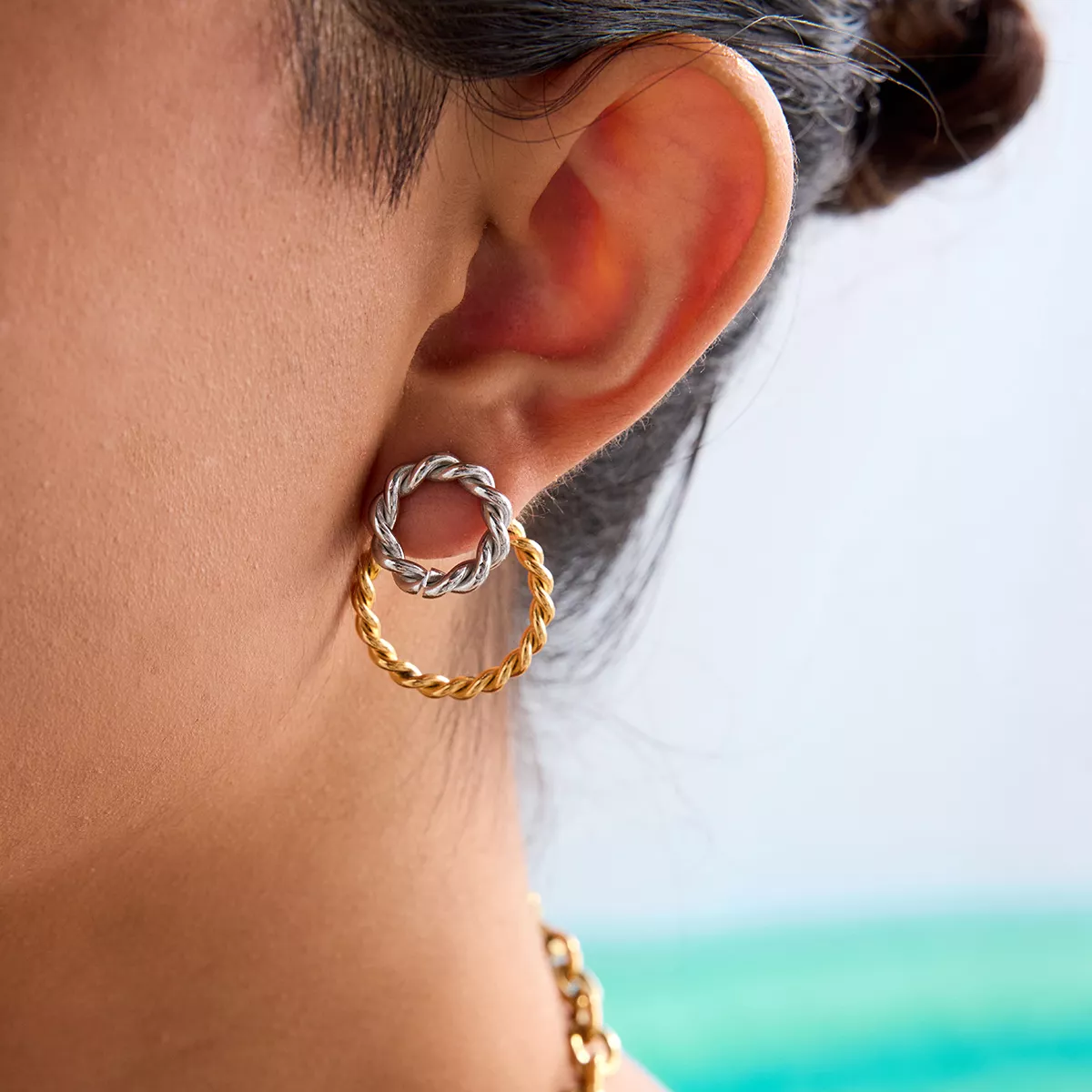 These earrings are your new everyday essential. Perfect for office wear, brunch dates, cocktail evenings, or simply adding a little flair to your jeans-and-tee combo. Their sleek, two-tone design makes them a standout accessory for any occasion—subtle enough for daytime wear, yet striking enough for evening events.