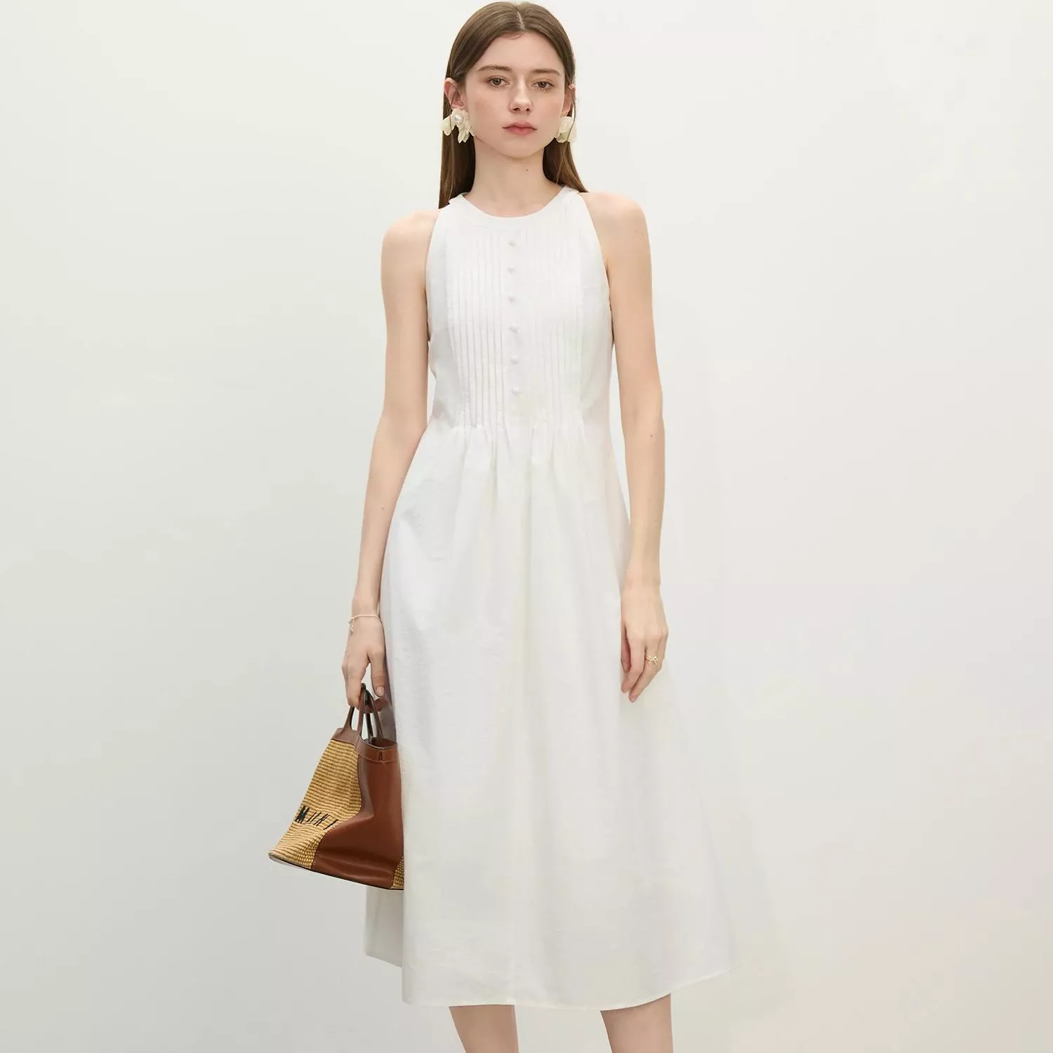 Step into summer with timeless elegance in this beautifully crafted slim-fitting dress. Designed for women who appreciate refined style and effortless sophistication, this mid-calf A-line dress features delicate accordion pleats that flow gracefully with every step. The halter-style neckline subtly draws attention to your shoulders and collarbones, while the O-neck adds a modern, modest touch.