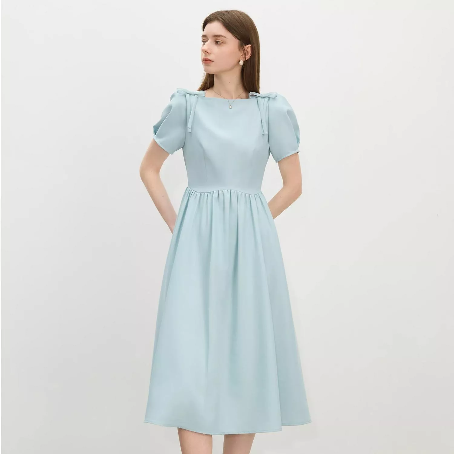This dress is made for warm, sunlit days and effortlessly transitions from office meetings to outdoor dinners. The design strikes the ideal balance between playful and polished, making it suitable for a wide range of occasions during the summer months. What makes this piece truly special is its understated elegance — the clean solid color, modern square neckline, and feminine bow detail come together to create a look that’s both trend-forward and timeless.