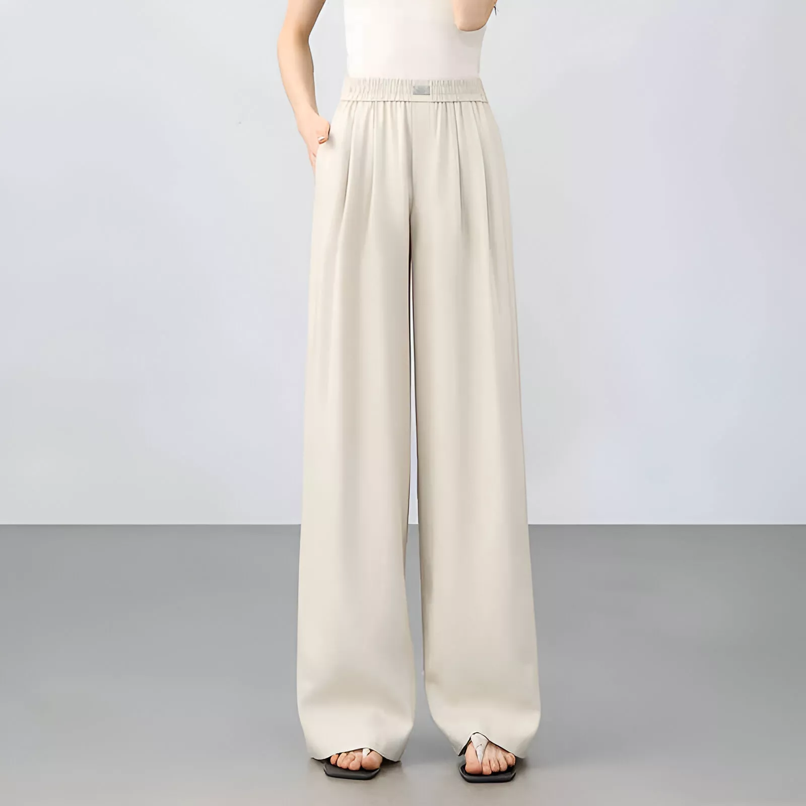 These pants are all about blending form with function. The high-rise elastic waistband ensures a snug yet flexible fit, flattering your natural silhouette while allowing for effortless wear throughout the day. Deep side pockets add a touch of utility without disturbing the clean, minimalist look. The floor-length cut paired with elegant pleats creates a graceful flow with every step, giving your outfit a polished, professional finish.