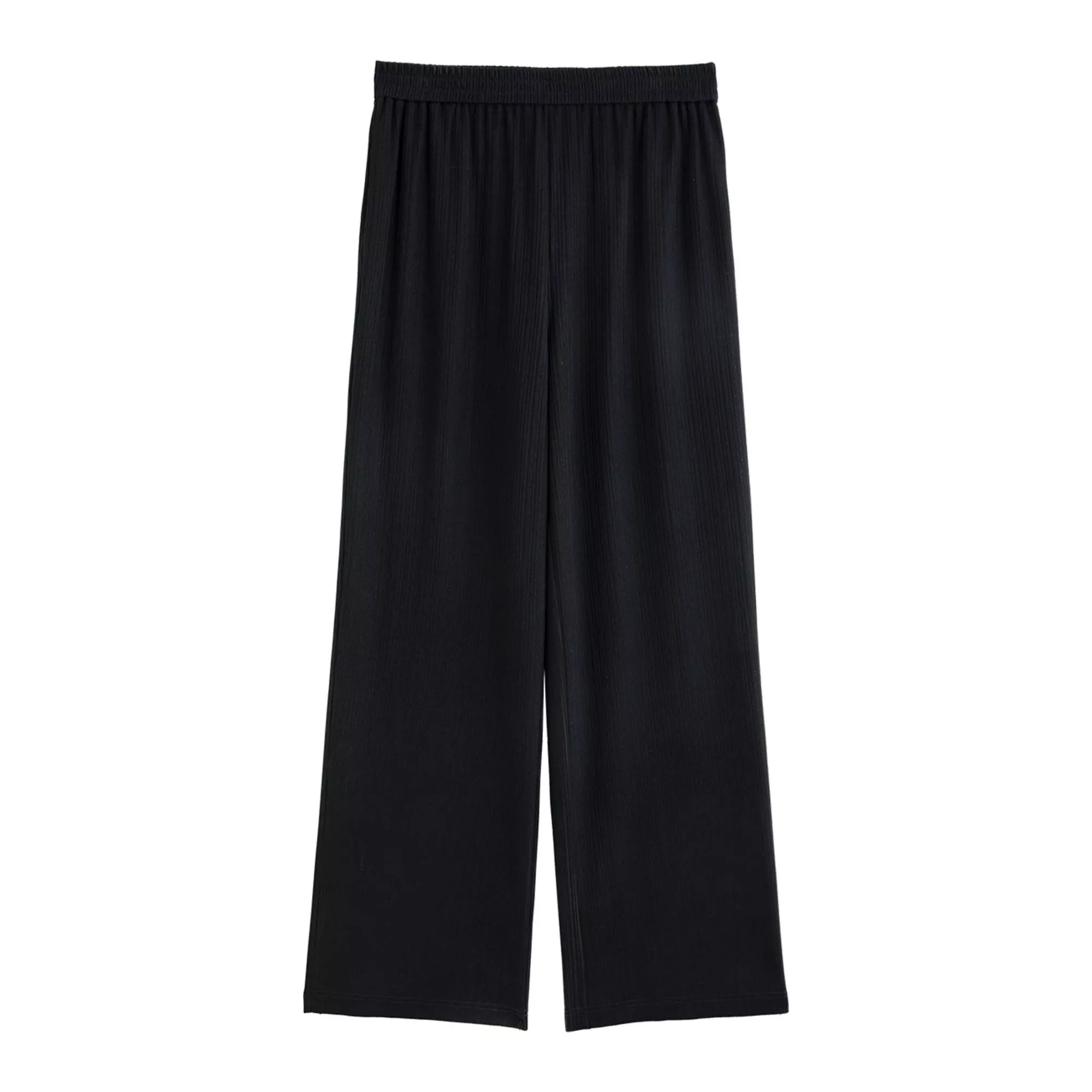 These wide-leg pants are designed for the modern woman who values both comfort and style. The elastic waistband ensures a secure yet flexible fit, while the high-waisted cut elongates the legs, giving you a tall, sleek look. The minimalist black color makes them easy to mix and match with your existing wardrobe, and the solid pattern offers a clean, sophisticated appearance that never goes out of style.