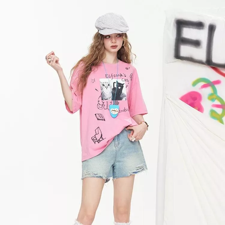 Pink Cat Graffiti Print Loose Fit Summer T-Shirt