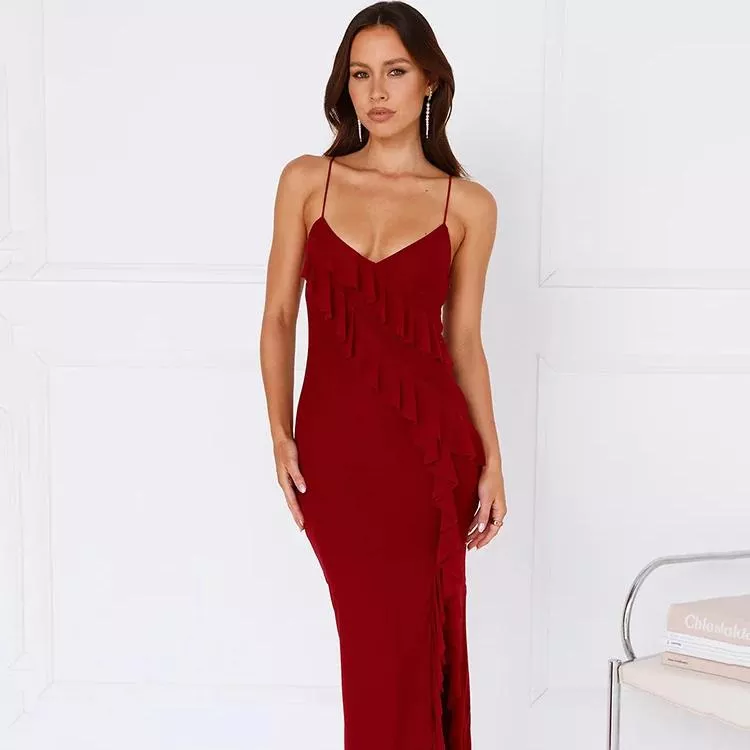 The sleek V-neckline, lace-up back, and high side split combine to create a bold yet graceful silhouette that captures attention from every angle. Lightweight polyester-spandex blend fabric gently caresses the skin, making it perfect for spring and summer days when you want to keep cool but stay chic. The ruffle detail adds a playful touch, while the sleeveless, backless design turns up the heat.