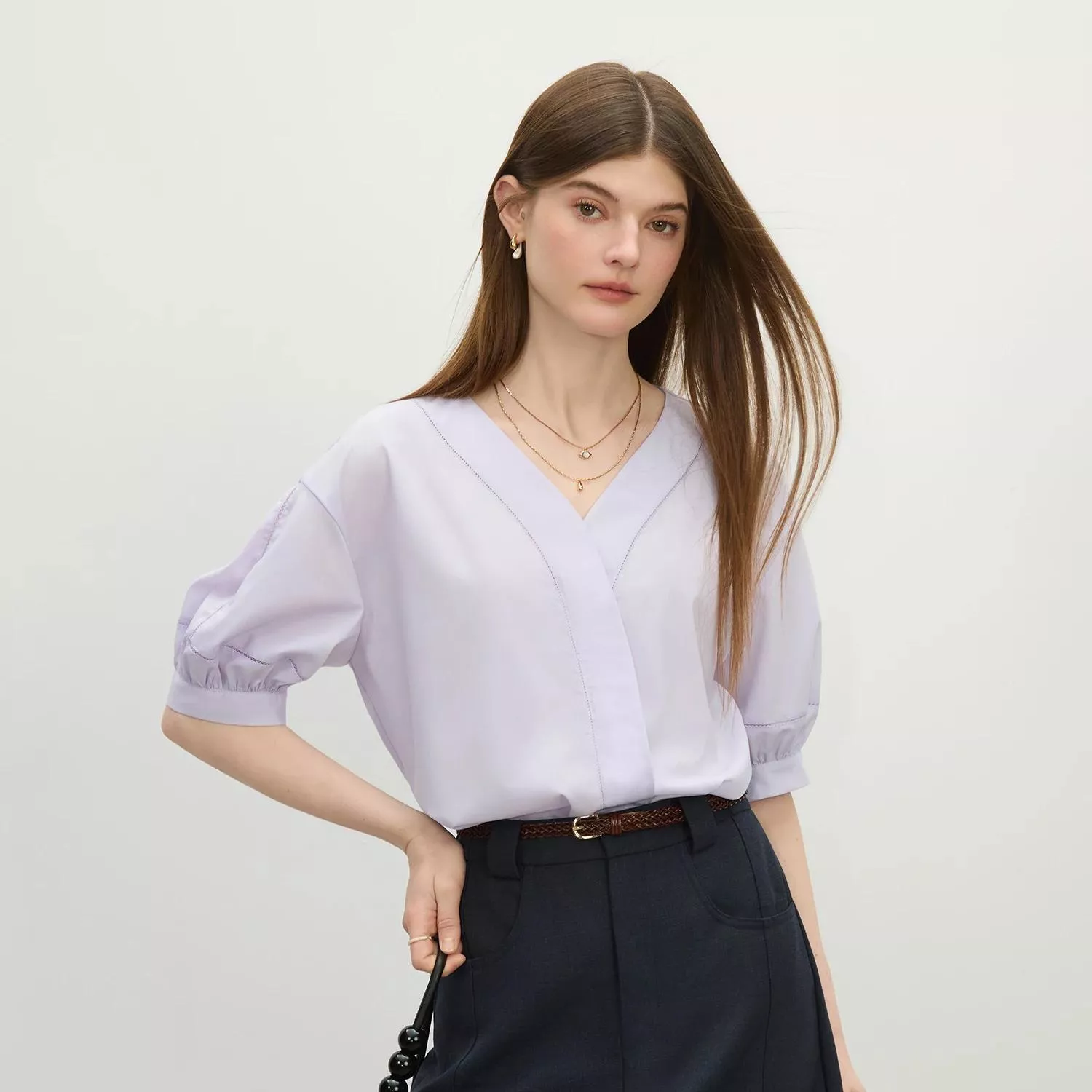 Crafted from a breathable broadcloth fabric with a soft synthetic fiber blend—76.6% polyester, 18.7% modal, and 4.7% spandex—this shirt offers just the right amount of stretch for ease of movement while remaining light and airy against the skin. The half-length sleeves and straight silhouette create a polished yet relaxed silhouette suitable for women of all ages, especially those who appreciate timeless style with a modern twist.
