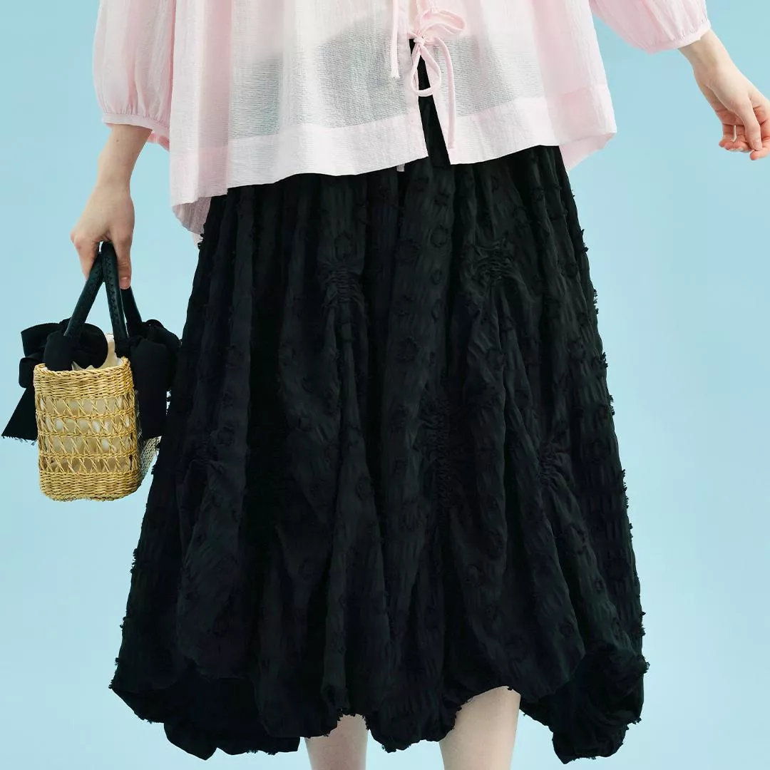 Whether you’re strolling through a weekend market, heading to brunch, or simply enjoying a sunny afternoon in the city, this skirt is your go-to choice for breathable, easy-going fashion. The light, blended polyester fabric offers a gentle drape and slight stretch, keeping you cool while allowing freedom of movement. The soft natural waistline and loose fit ensure comfort all day long, while the intricate three-dimensional floral details add depth and charm to your look.