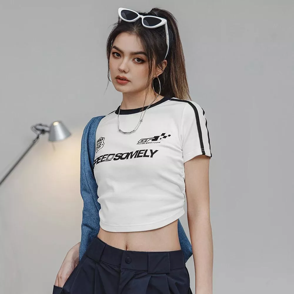 Perfect for streetwear lovers and minimalists alike, the tee balances simplicity with flair. Its cropped length pairs beautifully with high-waisted jeans, shorts, or skirts, making it an ideal staple for summer wardrobes. Whether you’re headed to a coffee date, a concert, or just out for a walk, this tee keeps you looking put-together with zero effort.