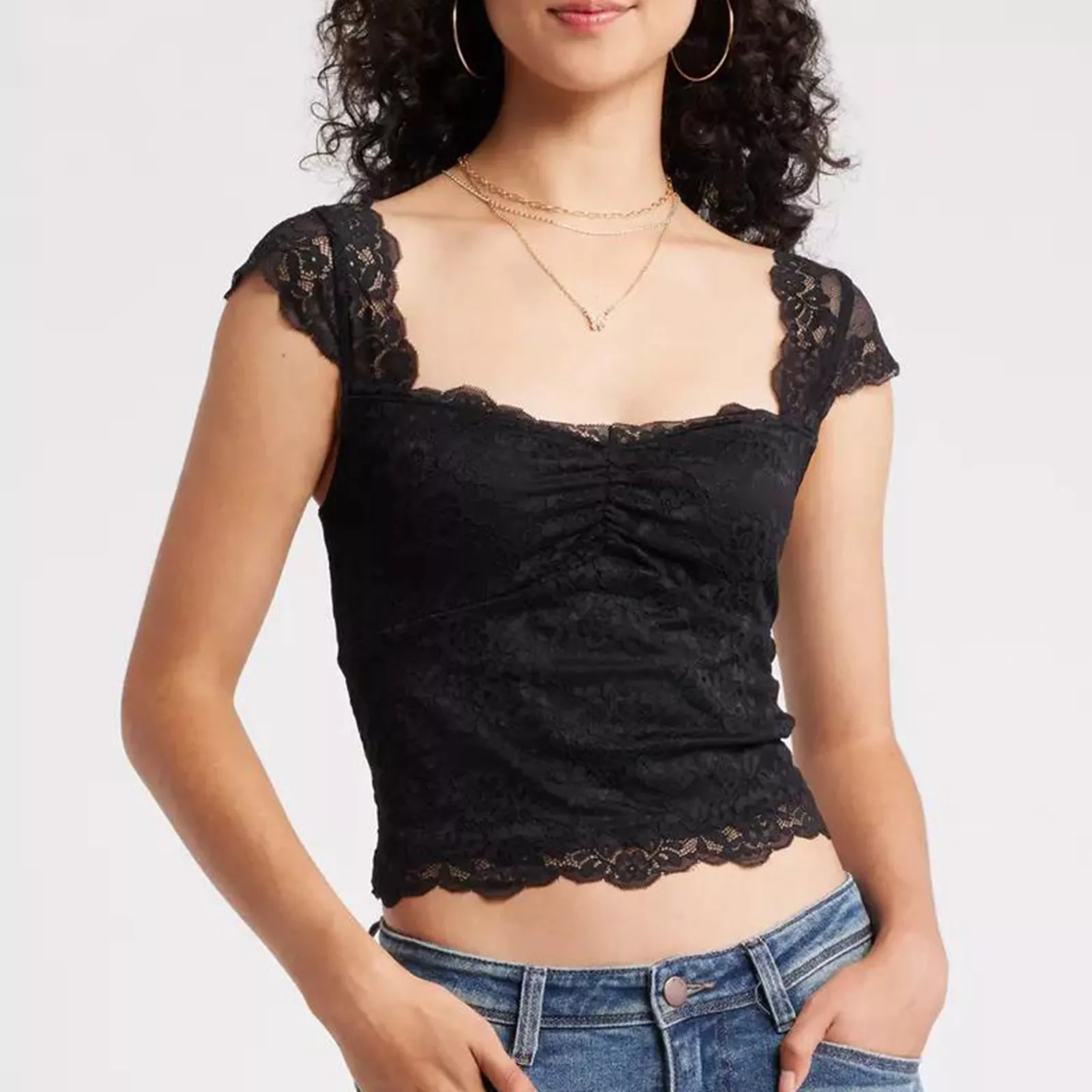 Crafted from a soft, breathable blend of 95% polyester and 5% elastane, it offers a slightly stretchy fit that flatters your silhouette while keeping you cool and comfortable. The short cap sleeves and delicate mesh lace fabric bring a light, airy feel—perfect for sunny days and summer nights. The square neckline adds a modern twist, enhancing the neckline and framing your collarbone beautifully.