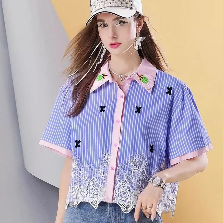 Featuring a classic polo collar and a full button-down front, this blouse combines timeless shirt styling with trend-forward detailing. The standout feature? An intricate lace patchwork hem that adds an unexpected feminine edge to the streetwear-inspired silhouette. The striped pattern brings structure to the loose, cropped design, making it perfect for pairing with high-waisted jeans, shorts, or skirts.