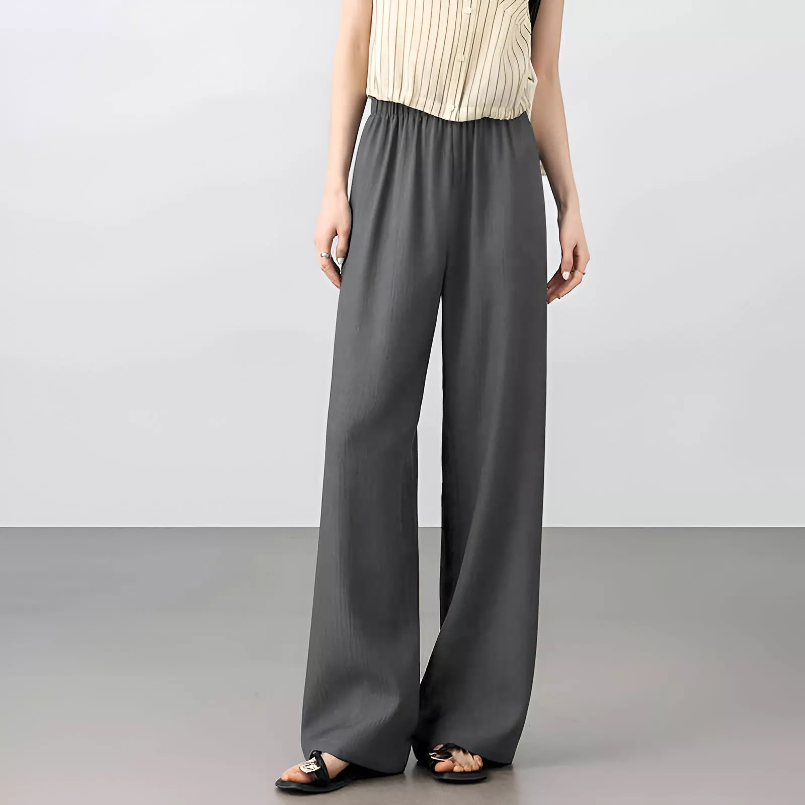 The elastic waistband ensures a snug yet flexible fit, making these trousers ideal for long days when comfort is key. Their solid color and minimalistic design make them a timeless piece you can dress up or down throughout the spring and summer seasons.